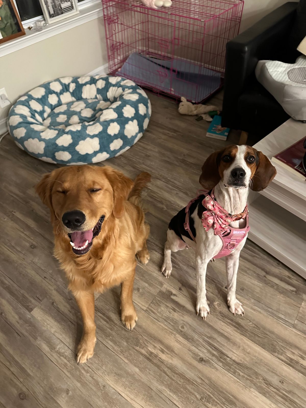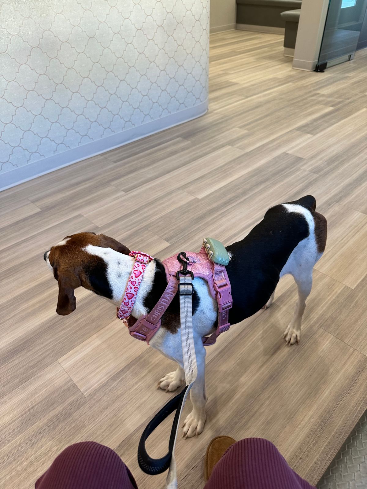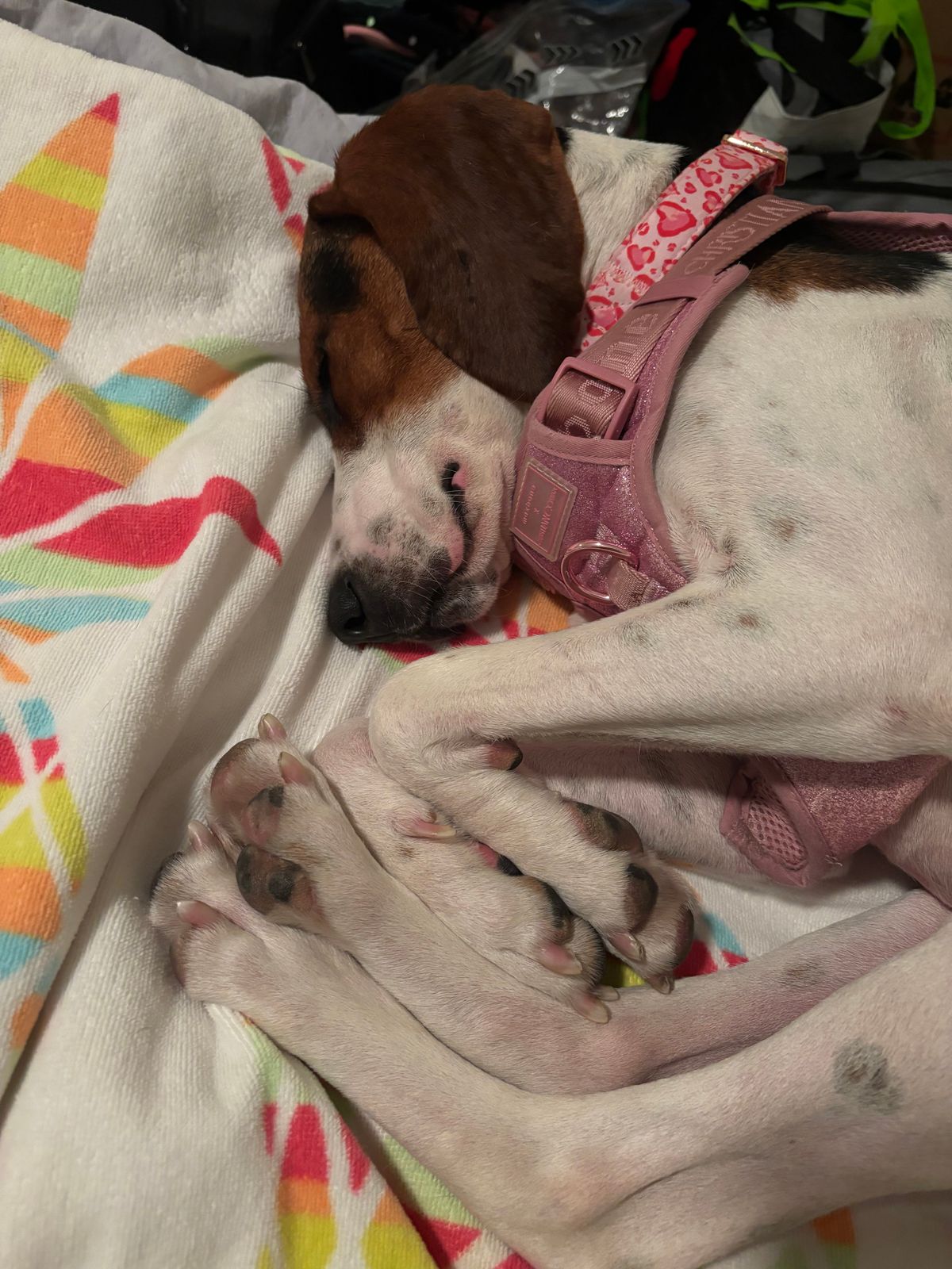 bought this for my 1 year old female treeing walker coonhound who is 40 pounds. straps are very easy to adjust and the entire harness is very well made and strong. we put her XL tractive on the back strap! she sleeps in it constantly so it’s very comfortable. the treat pounce with the matching leash is a great bonus. 10/10 recommend this harness!